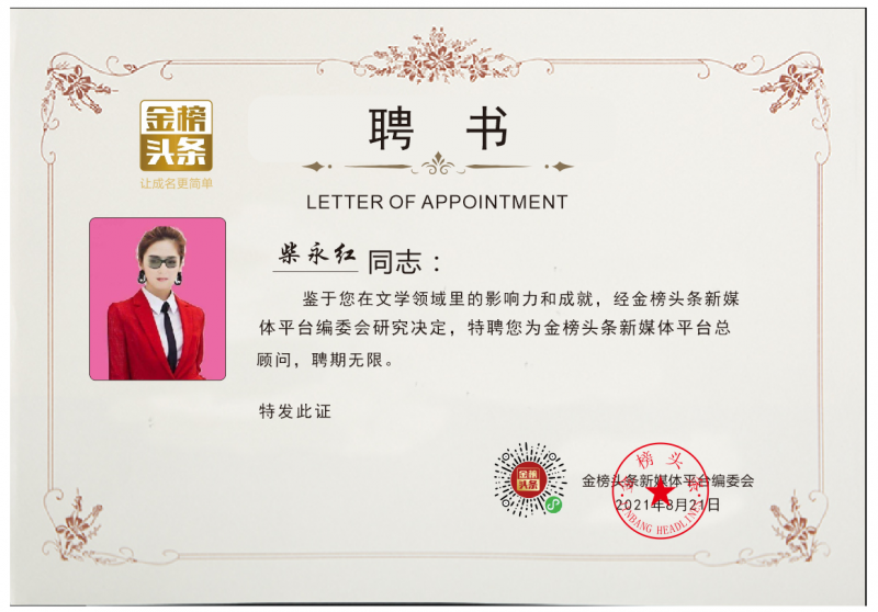 作为金榜头条形象大使、总编及职业作家,柴永红在文学创作之外,肩负起重要的文化传播使命。她以金榜头条为平台,精心策划、严格把关,汇聚各方佳作,为文学爱好者打造了一个精神家园。数字时代,她积极探索文化传播的新途径、新方式,将传统文学与现代媒体相结合,使文学作品能够更广泛地传播,发挥更大的社会价值。
