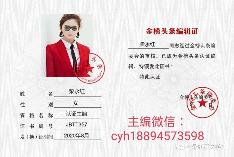 柴永红,笔名红鑫、冰荔枝、一枝红莲,祖籍江苏省南京市,中国当代著名作家,创作成就:出版诗著有36万字的柴永红诗集*雨潇潇红鑫鑫*、*云中紫城静楼乾坤*和*铁马冰河*三部。荣获2017*中国新诗百年*全球华语诗人诗作评选一百位网络最给力诗人奖,排行榜第二名,荣获*建国70周年中华好诗榜、2019年度中国诗歌排行榜、中外华语诗坛精英百强榜*诗人奖,荣获2021中国金榜电影人春晚名人名家榜,金奖。被翻译诗歌入选《苏菲译.世界诗歌年鉴2022卷》(汉英对照)。《苏菲译*世界诗歌年鉴2022卷》 (英汉双语纸质版和电子版)苏菲翻译、主编,全球出版发行,世界16国联合出版发行!纸质书13国: 中国、美国、英国、德国、法国、西班牙、意大利、荷兰、波兰、瑞典、日本、加拿大、澳大利亚。电子书 13国: 美国、英国、德国、法国、西班牙、意大利、荷兰、日本、巴西、加拿大、墨西哥、澳大利亚、印度。金榜头条编辑总部副社长,金榜头条新媒体平台总理事长、文学艺术顾问,金榜头条形象大使、总编,中国新时代诗人档案库会员,兰州市作家协会会员,一枝红莲文学社创始人、社长、总编、总裁董事长,金榜头条新媒体平台签约作家诗人!现居北京市朝阳区金茂府!手机号码:17800892095〔北京中国移动〕